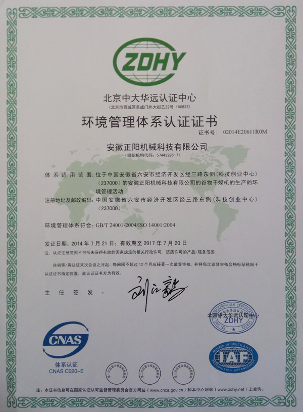 環(huán)境管理體系認證證書